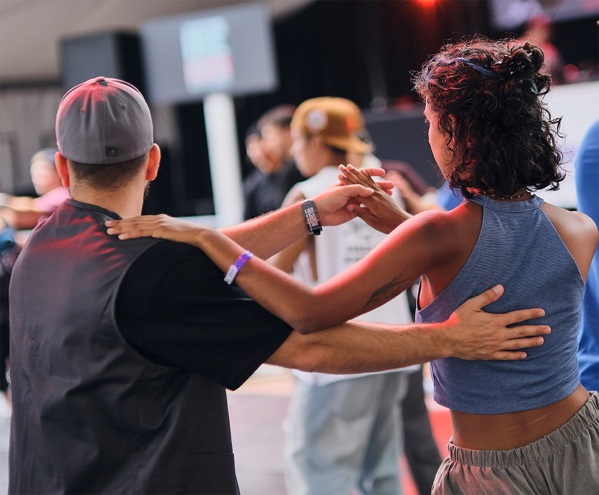 Hustle is more than a partner dance; it’s a space for connection, expression and community.Whill street styles often focus on solo dancers, Hustle offers a space to lead, follow, surrender, and connect with each other. At IBE, hustle stands alongside other street styles that have shaped dance culture from the ground up.